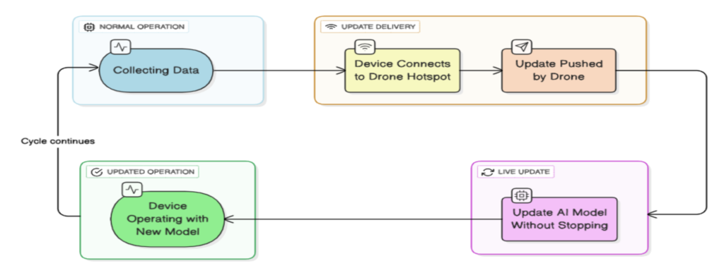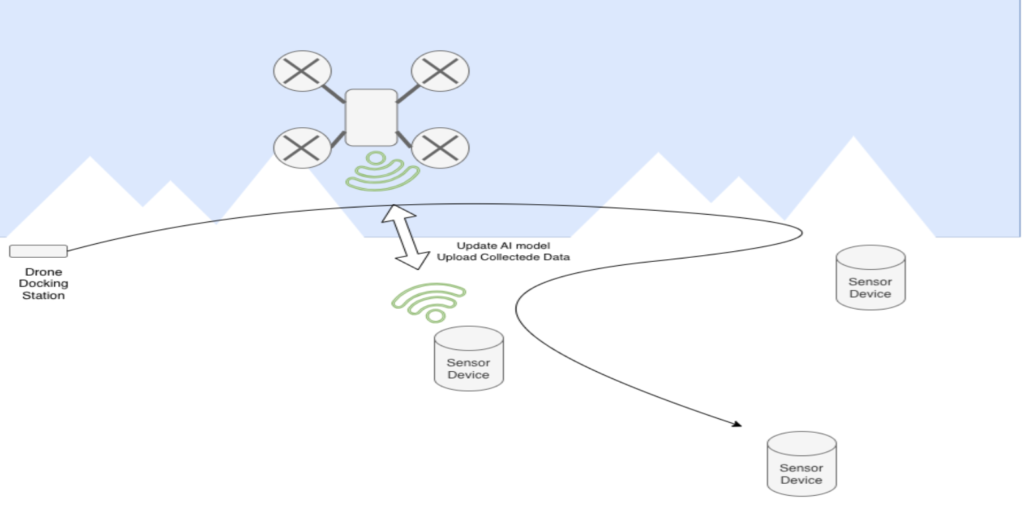 The framework’s communication layer is designed for automated data transfer from sensor devices to intermediaries such as drones, to the cloud, using both WiFi and LoRa communication technologies. A drone can fly over a deployment site, establish a connection with the sensor device, download the collected data, as well as deliver an update to the device’s AI model. This capability eliminates the need for often difficult manual servicing in hard-to-reach areas. A single drone can autonomously update and manage an entire network of sensors spread across hard-to-reach areas such as the Arctic, or wetlands, where human servicing would be difficult.